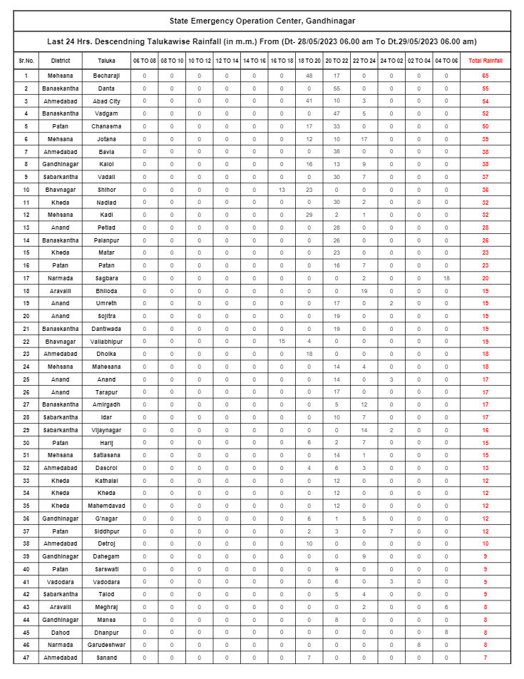 અમદાવાદના ચાંદખેડામાં 3 ઈંચ વરસાદ સાથે ગોતા અને સરખેજમાં 2.5 ઈંચ વરસાદ વરસ્યો હતો. તથા મણિનગર, ચાંદલોડિયા અને વટવામાં 2 ઈંચ વરસાદ પડ્યો છે. ગુજરાતમાં અનેક જિલ્લાઓમાં ગાજવીજ અને જોરદાર પવન સાથે વરસાદનો રાઉન્ડ જોવા મળ્યું હતું. રાજ્યમાં ચોમાસાની જાણે શરૂઆત થઇ ગઈ હોય તેવું લાગી રહ્યું છે. ગુજરાતના મોટાભાગના વિસ્તારોમાં ભારે વરસાદ ખાબક્યો હતો. જ્યારે કેટલાક વિસ્તારોમાં હળવો વરસાદ પડ્યો હતો. એવું અનુમાન લાગવામાં આવી રહ્યું છે કે, હવે આ ઉનાળાનો છેલ્લો તબક્કો છે અને ત્યારબાદ વરસાદના પગલે કાળઝાર ગરમીમાંથી લોકોને રાહત મળી શકે છે. જોકે હવામાન વિભાગની આગાહી છે કે આજથી આગામી 2 દિવસમાં ગુજરાતમાં ભારે પવન સાથે વરસાદ આગાહી કરવામાં આવી છે.