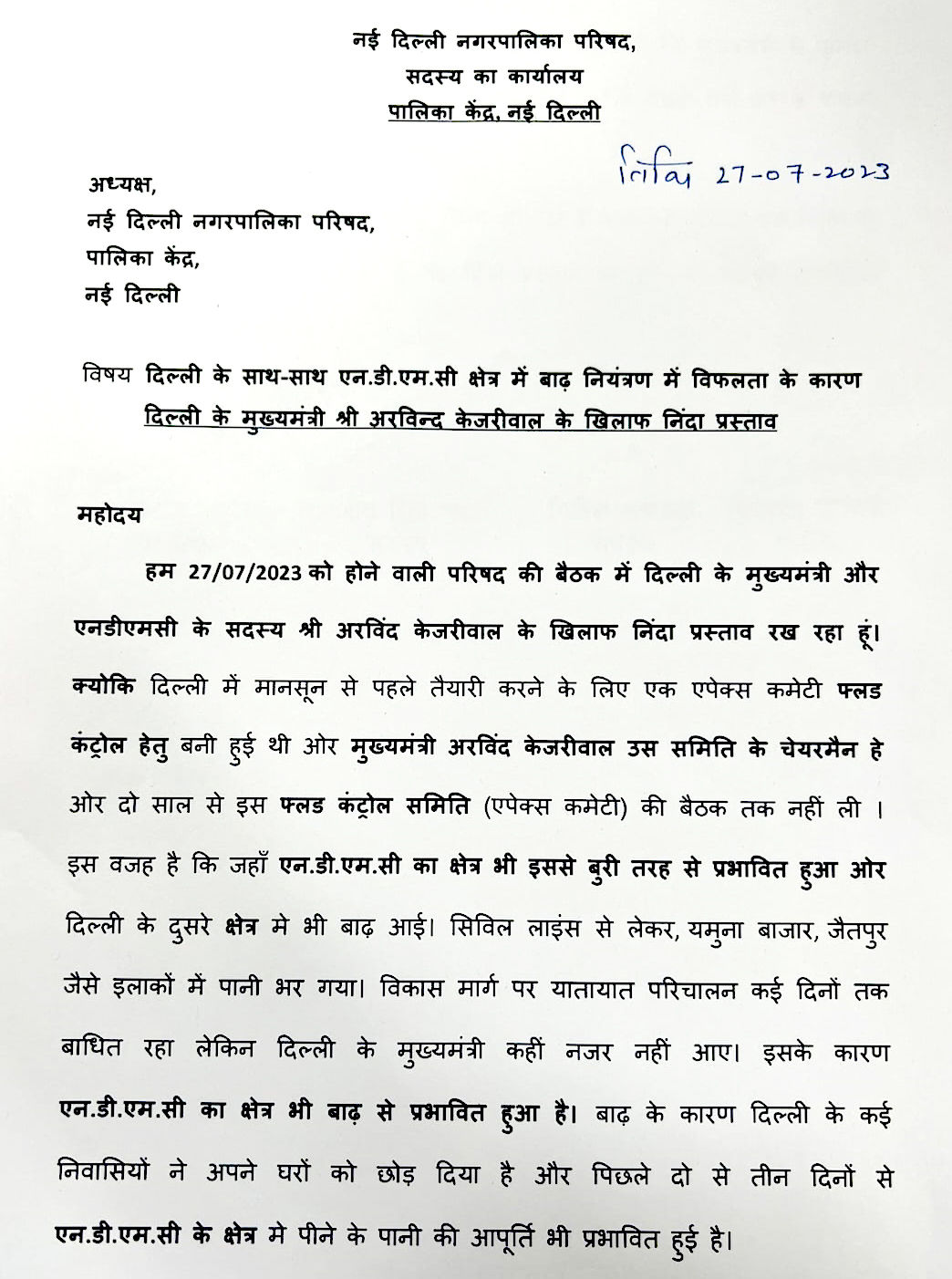 કેજરીવાલ પર આક્ષેપ કરાયો છે કે, તેઓ એપેક્સ કમિટી ફ્લડ કંટ્રોલ સમિતિના ચેરમેન હોવા છતાં તેમજ આગોતરું આયોજન કરવા માટે એકપણ બેઠક યોજી ન હોવાના કારણે પૂરના કારણે એનડીએમસીનો વિસ્તાર અને દિલ્હીના અન્ય વિસ્તારો ખુબ જ ખરાબ રીતે પ્રભાવિત થયા છે. યમુના નદીનું પાણી સિવિલ લાઈન્સથી લઈને યમુના બજાર, જેતપુર જેવા વિસ્તારો સુધી પહોંચતા પાણી ભરાઈ ગયા હતા. ઉપરાંત વિકાસ માર્ગ પર પણ ઘણા દિવસો સુધી ટ્રાફિક અવરોધાયો… પૂરના કારણે દિલ્હીના ઘણા રહેવાસીઓએ પોતાનું ઘર છોડચું પડ્યું… ઉપરાંત છેલ્લા બેથી ત્રણ દિવસ સુધી એનડીએમસી વિસ્તારમાં પીવાના પાણીનો પૂરવઠો પણ ખોરવાયો…