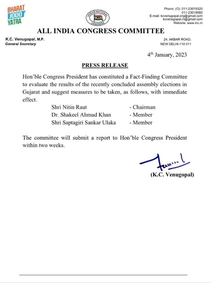 કોંગ્રેસના રાષ્ટ્રીય પ્રમુખ મલ્લાર્જુન ખડગેએ ગુજરાતના પરાજય બાદ સત્ય શોધક કમિટીની રચના કરી છે. જેમાં ત્રણ સભ્યોની કમિટી બનાવવામાં આવી છે. આ કમિટીના ચેરમેન તરીકે નીતિન રાઉત, ડો. શકિલ અહેમદ ખાન તથા સપ્તગિરી શંકર ઉલાકાની સભ્ય તરીકે નિમણુંક કરાઈ છે. આ કમિટી કોંગ્રેસ પ્રમુખને ગુજરાતની હારના કારણો અને પરિણામો અંગેનો રીપોર્ટ એક સપ્તાહમાં સોંપશે. ત્યાર બાદ કોંગ્રેસનો હાઈકમાન્ડ ગુજરાતમાં સંગઠનમાં મોટો ફેરફાર કરે તેવી શક્યતાઓ સેવાઈ રહી છે.