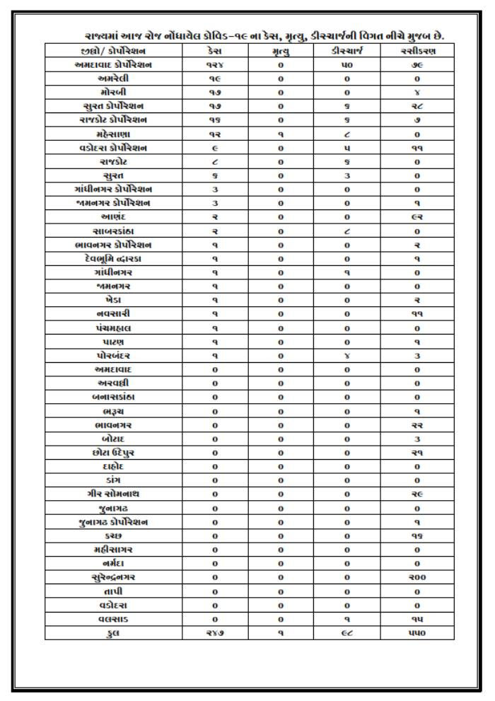 અમદાવાદમાં 124, અમરેલી 19, મોરબી 17, સુરત જિલ્લામાં 23, રાજકોટ જિલ્લામાં 24, મહેસાણામાં 12, વડોદરામાં 9, ગાંધીનગર જિલ્લામાં 4, જામનગર જિલ્લામાં 4, આણંદમાં 2, સાબરકાંઠામાં 2, ભાવનગર, દ્વારકા, ખેડા, નવસારી, પંચમહાલ, પાટણ અને પોરબંદરમાં એક એક કેસ નોંધાયો છે. આજે સૌથી વધુ કેસ અમદાવાદ કોર્પોરેશનમાં નોંધાયા છે.