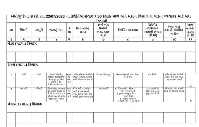 નવસારી જિલ્લાના વહીવટી તંત્રના જણાવ્યા અનુસાર વરસાદને કારણે પંચાયત વિભાગ હસ્તકના કુલ 57 રસ્તાઓ બંધ કરવામાં આવ્યા છે, જેની લોકો નોંધ લેવા જણાવવામાં આવ્યુ હતું. આ ઉપરાંત અનેક જગ્યાએ ટ્રાફિકને ડાઈવર્ટ કરવામાં આવ્યો છે. શાળા કોલેજથી પરત ફરતા વિદ્યાર્થીઓને ઘરો પહોચવામાં મુશ્કોલીનો સામનો કરવો પડ્યો હતો.