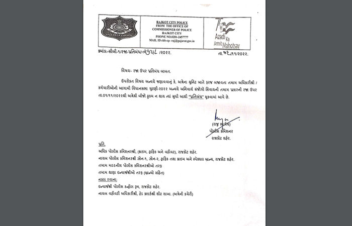 રાજકોટના પોલીસ કમિશનરે મંગળવારે એક પરિપત્ર જાહેર કરી રાજકોટ શહેર પોલીસની તમામ રજા ઉપર પ્રતિબંધની જાહેરાત કરી છે.