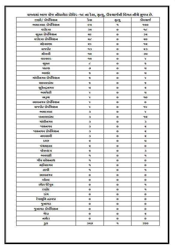 આજે અમદાવાદ જિલ્લામાં 98, વડોદરા જિલ્લામાં 60, સુરત જિલ્લામાં 37, મહેસાણામાં 24, રાજકોટ જિલ્લામાં 17, ગાંધીનગર જિલ્લામાં 9, જામનગર જિલ્લામાં 6, વલસાડમાં 12, મોરબીમાં 12, આણંદમાં 6, પાટણમાં 7, સાબરકાંઠામાં 6, સુરેન્દ્રનગરમાં 5, અમરેલીમાં 4, ભરૂચમાં 4, ભાવનગરમાં 4, બનાસકાંઠામાં 3, નવસારીમાં 3, કચ્છ, પોરબંદર અને પંચમહાલમાં બે બે કેસ, અરવલ્લી, ગીરસોમનાથ, મહિસાગર અને તાપીમાં એક એક કેસ નોંધાયો છે.