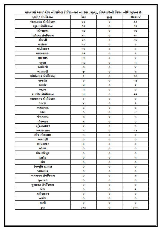 આજે અમદાવાદ જિલ્લામાં 96, વડોદરા જિલ્લામાં 43, સુરત જિલ્લામાં 41, મહેસાણામાં 26, રાજકોટ જિલ્લામાં 11, ગાંધીનગર જિલ્લામાં 22,  વલસાડમાં 11, મોરબીમાં 23, આણંદમાં 5, પાટણમાં 4, સાબરકાંઠામાં 12, સુરેન્દ્રનગરમાં 2, અમરેલીમાં 7, ભરૂચમાં 4, ભાવનગરમાં 4, બનાસકાંઠામાં 1, નવસારીમાં 7, કચ્છમાં 3,  પંચમહાલ અને પોરબંદરમાં બે બે કેસ, ભાવનગરમાં 4, ગીર સોમનાથમાં 1, ભરૂચમાં 5 કેસ નોંધાયા છે.