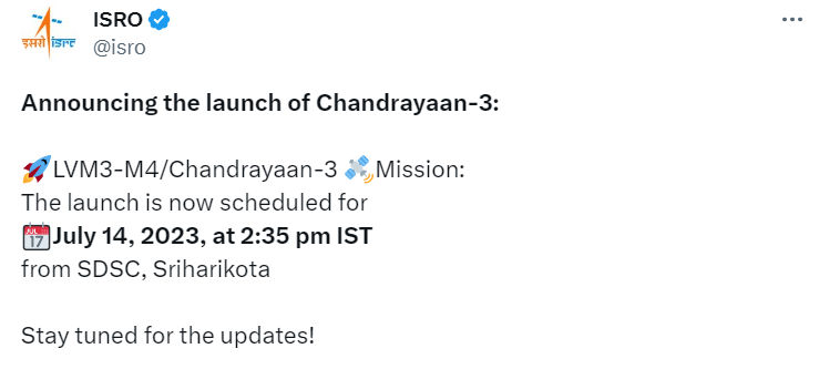 ઈન્ડિયન સ્પેસ રિસર્ચ ઓર્ગેનાઈઝેશએ બહુપ્રતીક્ષિત મિશન ચંદ્રયાન-3ની પ્રક્ષેપણ તારીખ જાહેર કરી છે. ચંદ્રયાન-3 14 જુલાઈએ બપોરે 2.35 કલાકે લોન્ચ થશે. અગાઉ, ISROએ 12 અને 19 જુલાઈ વચ્ચેની તારીખ નક્કી કરી હતી. ચંદ્રયાન-3 મિશનનો મુખ્ય ઉદેશ્ય ચંદ્રની સપાટી પર સુરક્ષિત લેન્ડીંગ કરવા પર છે. આ પહેલા ઈસરોના અધ્યક્ષ એસ. સોમનાથે કહ્યું હતું કે, અંતરિક્ષ ક્ષેત્રમાં આ ભારતની બીજી મોટી સફળતા હશે.