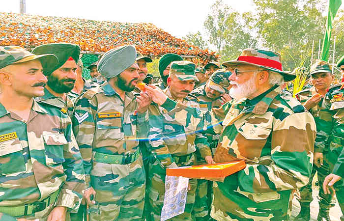 નૌશેરા : હિન્દુઓના પવિત્ર તહેવાર દિવાળીની ઊજવણી સરહદ પર જવાનો સાથે કરવાની પરંપરા જાળવી રાખતાં વડાપ્રધાન નરેન્દ્ર મોદીએ ગુરુવારે જમ્મુ-કાશ્મીરમાં રાજૌરી જિલ્લાની સરહદે નૌશેરા સેક્ટરમાં જવાનોને સંબોધન કર્યું હતું. વડાપ્રધાને કહ્યું કે જવાનોની શુરવીરતાના કારણે દેશવાસીઓ શાંતીથી ઊંઘી શકે છે. નૌશેરા કાશ્મીર અને શ્રીનગરનું પહેરેદાર છે. તમે માતા ભારતીના સુરક્ષા કવચ છો. તેમણે શહિદ જવાનોને શ્રદ્ધાંજલી આપતા કહ્યું કે, સર્જિકલ સ્ટ્રાઈકમાં અહીંની બ્રિગેડની ભૂમિકા દેશ માટે ગૌરવરૂપ છે.