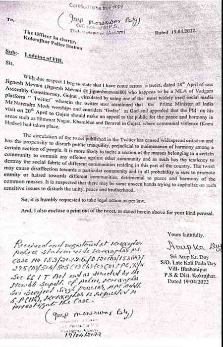 જોકે, સોશિયલ મીડિયા ઉપર આસામ ખાતે કરવામાં આવેલી ફરિયાદ વાયરલ થઈ છે. આ ફરિયાદમાં તા. 18 એપ્રિલે જીજ્ઞેશ મેવાણીએ વડાપ્રધાનને સંબોધન કરી એક મેસેજ કર્યો હતો.
