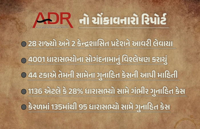 વિશ્લેષણમાં 28 રાજ્યની વિધાનસભાઓ અને 2 કેન્દ્રશાસિત પ્રદેશોમાં કાર્યરત કુલ 4,033માંથી 4,001 ધારાસભ્યોને આવરી લેવામાં આવ્યા છે. જેના આધારે એડીઆર રિપોર્ટ બહાર આવ્યો છે. ADR મુજબ, વિશ્લેષણ કરાયેલા 1,136 અથવા લગભગ 28 ટકા ધારાસભ્યોએ પોતાની સામે ગંભીર ગુનાહિત કેસ જાહેર કર્યા હતા. જેમાં હત્યા, હત્યાનો પ્રયાસ, અપહરણ અને મહિલાઓ વિરુદ્ધના ગુનાઓ સામેલ છે.