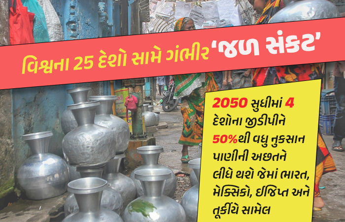 વર્ષ 2050 સુધીમાં વિશ્વની 70 ટ્રિલિયન ડોલરની જીડીપી પાણીની અછતથી પ્રભાવિત થશે, જે 31 ટકા જેટલી હશે. આ આંકડો વર્ષ 2010માં $15 ટ્રિલિયનના જીડીપી કરતાં 7 ટકા વધુ છે. અગાઉ તે 24 ટકા હતો. દર ચાર વર્ષે જાહેર કરવામાં આવેલા આ રિપોર્ટ અનુસાર, વર્ષ 2050માં વિશ્વના 4 દેશો પાણીની અછતને કારણે તેમના જીડીપીના અડધાથી વધુનું નુકસાન ભોગવવાના છે. તેમાં ભારત, મેક્સિકો, ઇજિપ્ત અને તુર્કીયેનો સમાવેશ થાય છે.  રિપોર્ટમાં ખુલાસો થયો કે વિશ્વના 25 દેશો, જેમાં વિશ્વની ચોથા ભાગની વસ્તીનો સમાવેશ થાય છે. તેઓ દર વર્ષે પાણીની અછતની ગંભીર સમસ્યાનો સામનો કરે છે. આ દેશોમાં સૌથી વધુ અસર બહેરીન, સાયપ્રસ, કુવૈત, લેબેનોન અને ઓમાન પર થાય છે. આ વિસ્તારો પાણીની અછત માટે સંવેદનશીલ બની શકે છે અને દુષ્કાળનો સામનો કરી શકે છે.