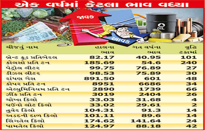 પણ દેશની પ્રજા માટે માત્ર પેટ્રોલ કે ડિઝલના ભાવ જ નહી પણ અન્ય ચીજોમાં જોવા મળી રહેલી મોંઘવારી પણ એક મોટો બોજ છે. છેલ્લા એક વર્ષમાં રાંધણ ગેસ, ખાદ્યતેલ, ચોખા, ઘઉંનો લોટ, દાળ અને કઠોળ બધાના ભાવમાં તોતિંગ વધારો જોવા મળી રહ્યો છે. ઇંધણ અને અન્ય ધાતુઓના ભાવ વધ્યા હોવાથી ઉત્પાદન ખર્ચ વધ્યો છે અને તેના લીધે તૈયાર ખાદ્ય સામગ્રી પણ મોંધી થઇ છે. આ બોજ એવા સમયે આવી પડયો છે કે જયારે કોરોનાની મહાભયંકર બિમારી, આર્થિક મંદીમાંથી દેશ અને દેશની પ્રજા બહાર આવી રહી હોય. આ સ્થિતિમાં મોંઘવારીથી પ્રજાને રાહત મળશે કે કેમ તે એક સવાલ છે.