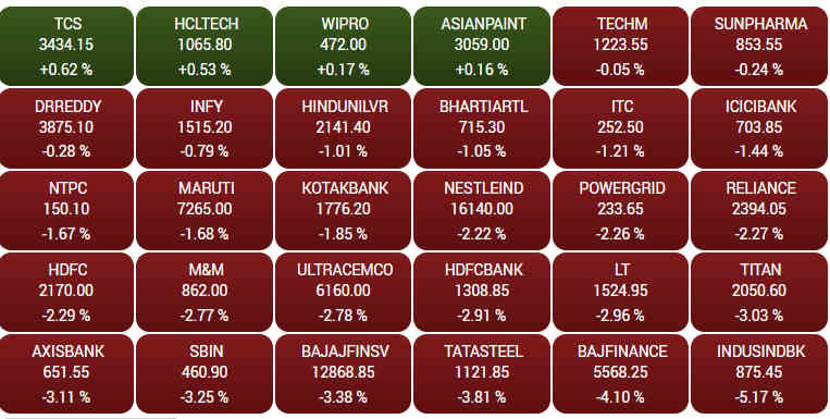 આજે બીએસઈ સેન્સેકસના 25 શેર ઘટાડા સાથે જ્યારે 5 શેર જ તેજી સાથે કામકાજ કરી રહ્યાં છે. આ 5 શેરમાં HCL ટેક, TCS, ટેક મહિન્દ્રા, વિપ્રો અને એશિયન પેઇન્ટનો સમાવેશ થાય છે.