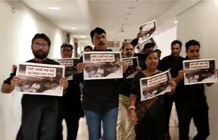 સત્ર શરૂ થતાં જ કોંગ્રેસના ધારાસભ્યો કાળા કપડાં પહેરીને વિરોધ કરી રહ્યાં હતાં. રાહુલ ગાંધી મુદ્દે પ્લે કાર્ડ લઈને ધારાસભ્યોએ સુત્રોચ્ચાર કર્યો હતો. ગૃહમાં હોબાળો થતાં જ અધ્યક્ષે કોંગ્રેસના ધારાસભ્યોને એક દિવસ માટે સસ્પેન્ડ કરી દીધા હતાં. ઉલ્લેખનીય છે કે સમગ્ર દેશમાં રાહુલ ગાંધીને લઈને વિરોધ પ્રદર્શન થઈ રહ્યું છે. બીજી તરફ અદાણી મુદ્દે વિપક્ષી દળના સાંસદોએ કાળા કપડાં પહેરી પોસ્ટર સાથે સંસદ ભવનમાં વિરોધ કર્યો હતો. જેના કારણે સંસદની કાર્યવાહી સ્થગિત કરી દેવામાં આવી હતી.