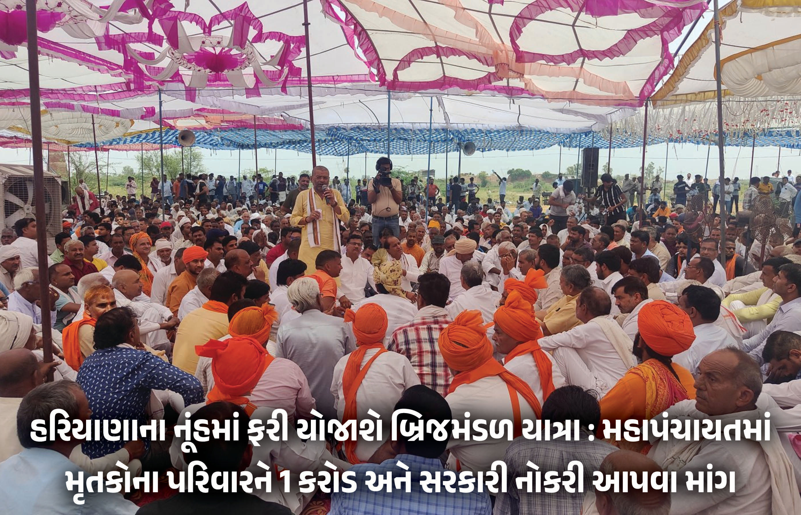 સર્વ હિન્દુ સમાજ દ્વારા નૂંહ સીમા નજીક આવેલા પલવર જિલ્લાના પોંડરી ગામમાં મહાપંચાયત યોજાઈ હતી. આ દરમિયાન નિર્ણય લેવાયો કે, બ્રિજમંડળ યાત્રા પરી કાઢવામાં આવશે,… કારણ કે ગત વખતની યાત્રા હિંસાના કારણે રોકી દેવાઈ હતી… કારણ કે ભીડે યાત્રા પર હુમલો કર્યો હતો, જેમાં 2 હોમગાર્ડ અને એક મૌલવી સહિત 6 લોકોના મોત થયા…