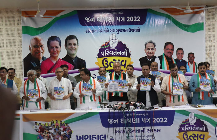 ગુજરાત વિધાનસભાની ચૂંટણીને લઈ કોંગ્રેસ પક્ષ દ્વારા મતદારો અને રાજયના પ્રજાજનોને લોભામણી જાહેરાતો અને વચનો આપતો મેનિફેસ્ટો જાહેર કરવામાં આવ્યો છે. રઘુ શર્મા, શક્તિસિંહ ગોહિલ અને પ્રદેશ કોંગ્રેસના નેતાઓની હાજરીમાં રાજસ્થાનના મુખ્યમંત્રી અશોક ગેહલોત મેનિફેસ્ટો જાહેર કર્યો છે. ‘બનશે જનતાની સરકાર’ના નામે મેનિફેસ્ટો જાહેર કરવામાં આવ્યો છે.